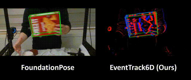 Event6D introduces an event-depth tracking framework for real-time 6D object pose tracking in fast and dynamic scenes. The method reconstructs both intensity and depth from sparse event streams at arbitrary timestamps conditioned on the latest depth observation, enabling robust tracking of novel objects without object-specific training. We also introduce a comprehensive benchmark suite consisting of a large-scale synthetic training dataset and complementary real and simulated event datasets for evaluation.